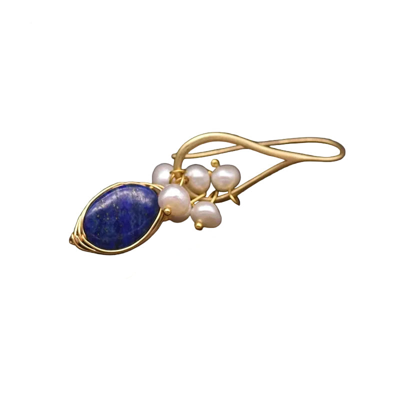 Este brinco combina a profundidade do azul do lápis-lazúli com a delicadeza das pérolas naturais, criando uma peça que equilibra força e suavidade em perfeita harmonia.