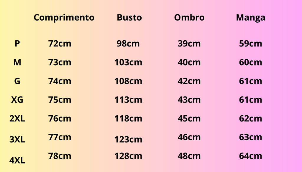Numeração P, M, G, XG, 2XL