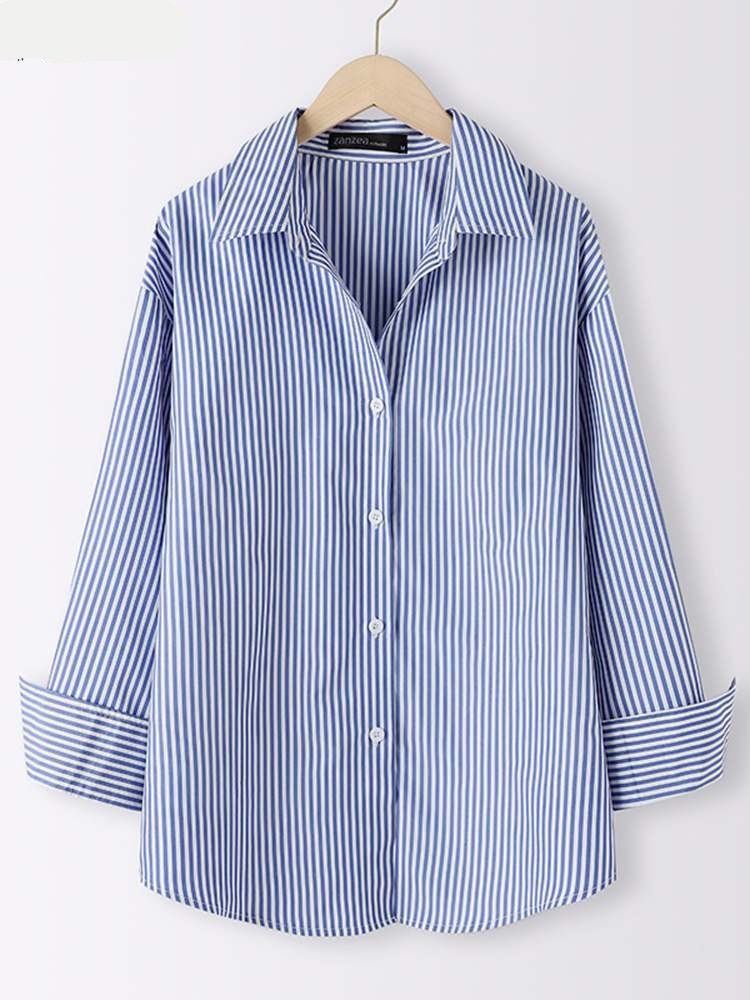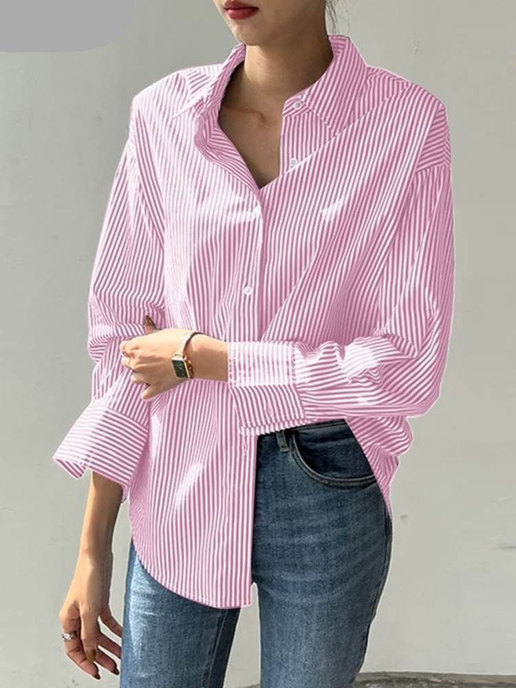 Se você busca uma peça ideal para todos os dias, A Camisa Feminina Manga Longa de Listras nunca te deixa na mão. Ela é super atual e combina com tudo.